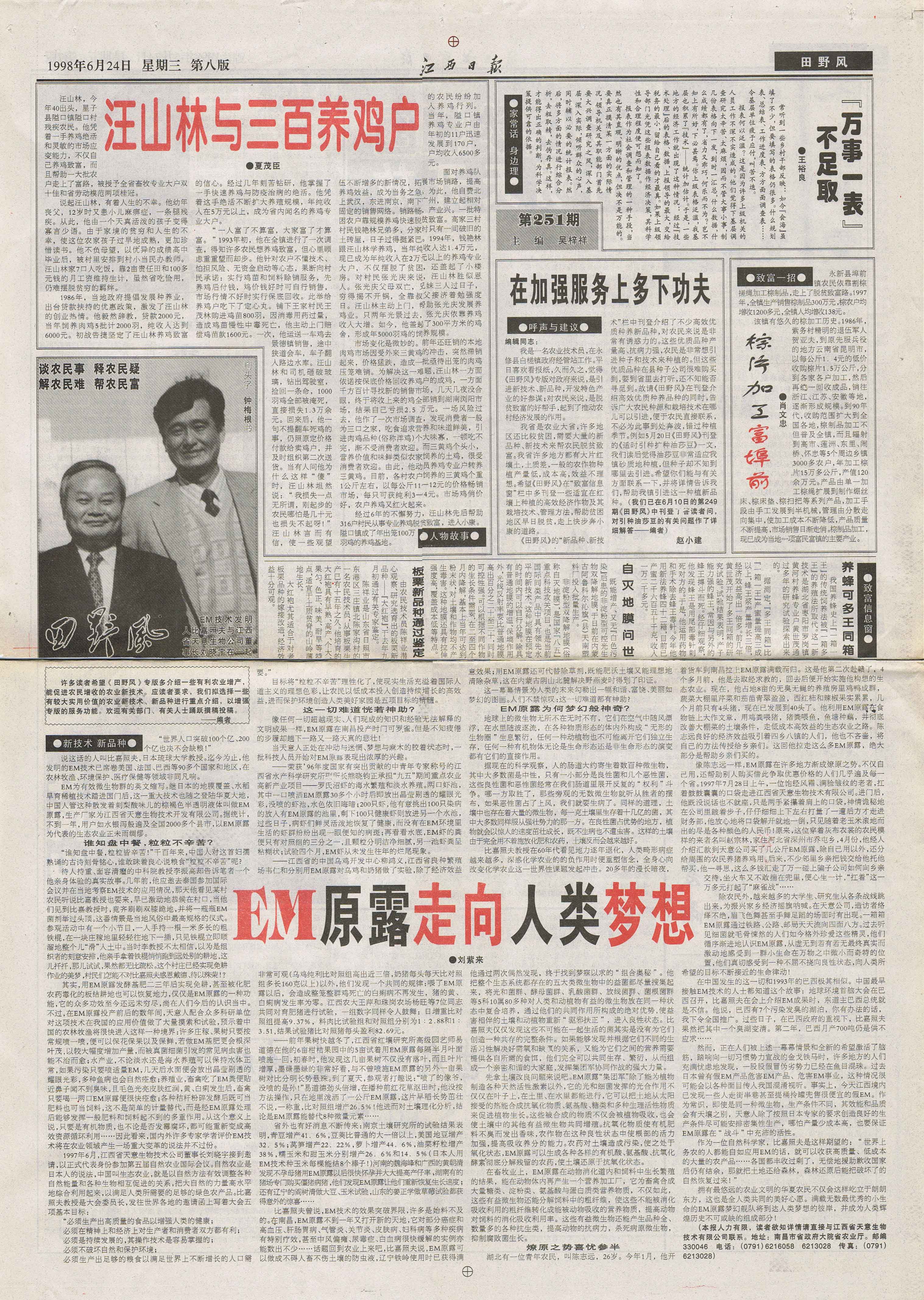 1997年,継《中國(guó)畜牧水產(chǎn)報(bào)》、《科技日?qǐng)?bào)》、《經(jīng)濟(jì)參考報(bào)》、《江西日?qǐng)?bào)》等媒體發(fā)表長(zhǎng)篇通訊《EM原露正在改變世界》,各省科技、農(nóng)業(yè)報(bào)刋均紛紛轉(zhuǎn)載,EM原露在江西最初的使用效果迅速在全國(guó)范圍內(nèi)興起了一股熱潮,兩年內(nèi)共簽定縣級(jí)代理合同500余家。